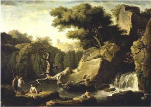 Two Female Peasants By A Waterfall, A Town And Aqueduct Beyond
