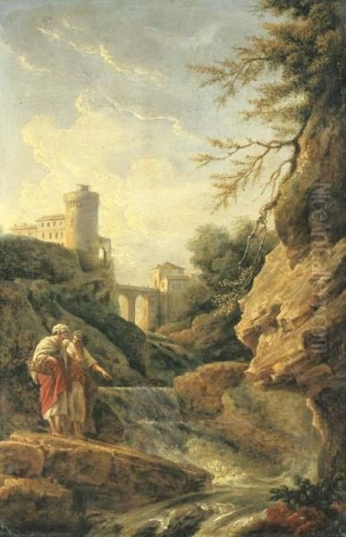 Two Female Peasants By A Waterfall, A Town And Aqueduct Beyond