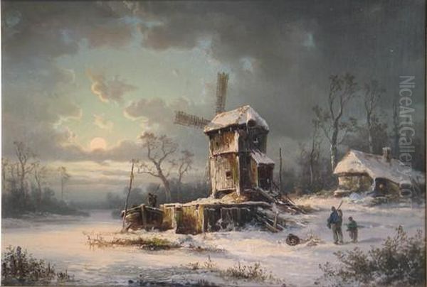 Romantische Winterlandschaft Mit Windmuhle Und Personen