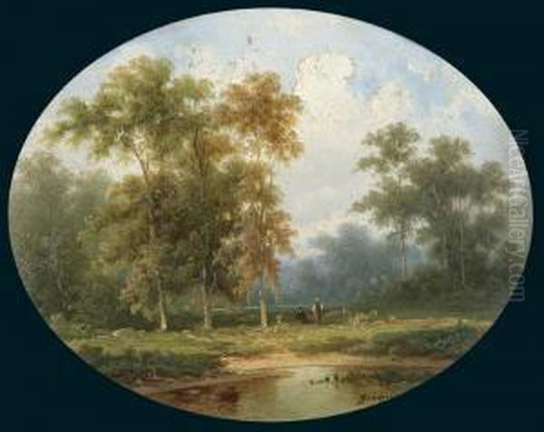 "ovale Romantische Waldlandschaft" Mit Personenstaffage