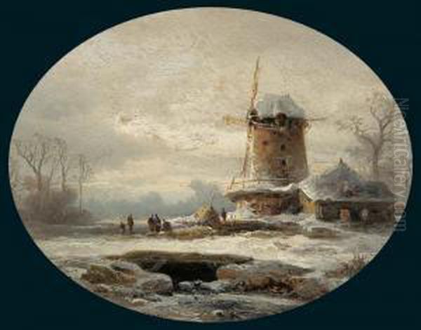 "ovale Romantische Winterlandschaft" Mit Personenstaffage