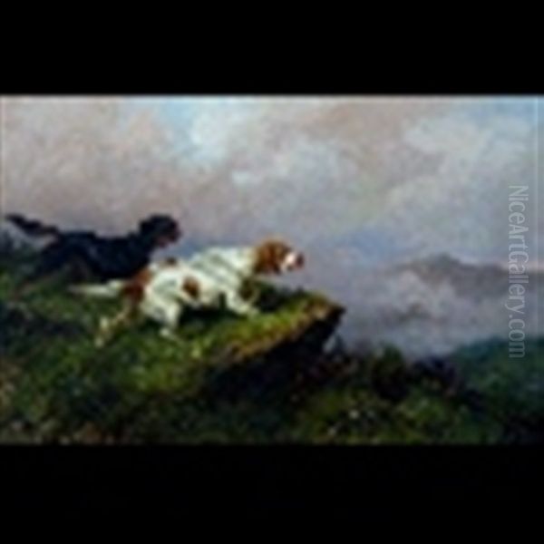 Moorland Landscape With Gun Dogs Crouching On A Rocky Outcrop