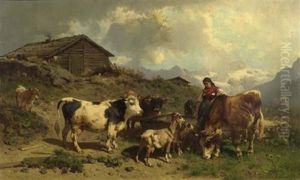 Hirten Mit Kuhen Vor Alpenlandschaft.