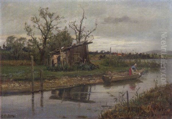 Wascherin Am Flusufer In Einem Kahn