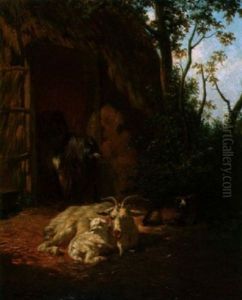 Ziegen Mit Zicklein Vor Dem Stall