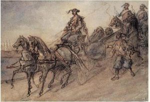 Cavalier Et Cavaliere, En Fond, Un Attelage
