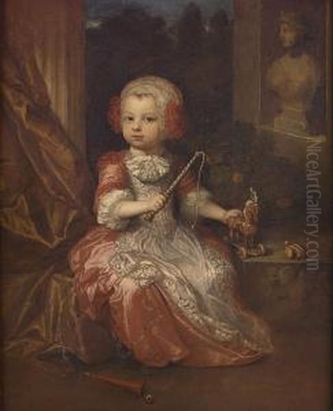 Portrait Of A Young Boy, Small-full-length, In A Salmon Coloured Gown With A Lace Trimmed Apron, And A Lace Bonnet, Holding A Crop And A Toy Horse, By A Partially Draped Column, A View To A Garden Beyond