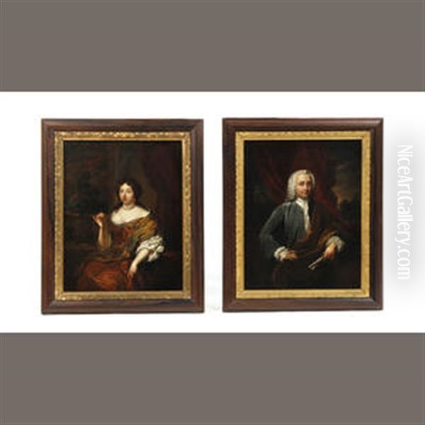 A Portrait Of A Lady Wearing Brown Dress And Pearl Necklace And Another Of A Gentleman Wearing A Wig (a Pair)