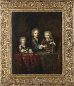 Kindergruppe, Hinter Einer Balustrade Mit Rechts Zusammengeschobenem Orientteppich Ein Kleines Madchen Mit Einem Hund Und Zwei Knaben Mit Einem Vogelkafig