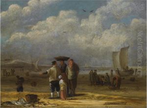 Elegant Figures Strolling On The Beach At Egmond Aan Zee,sailing Vessels Moored On Shore, And Fisher Folk Selling Theircatch In The Foreground