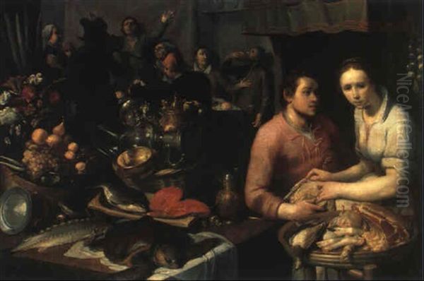 Froehliche Tischgesellschaft Mit Einer Koechin, Einem Gefluegelhaendler Und Einem Reichen Stilleben