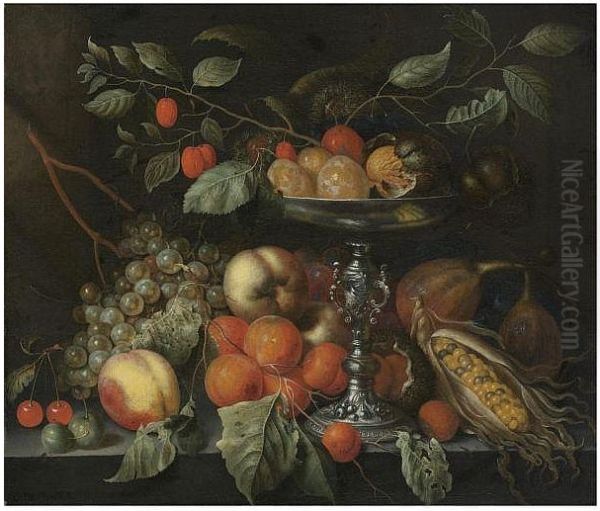 Cherries, Grapes, Apricots, Figs, Maize, And Other Fruit With A Silver Tazza On A Table