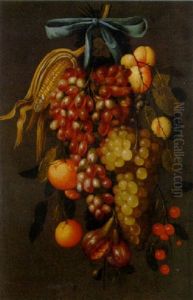 A Swag Of Abricots, Grapes, Cherries, A Fig, Chestnuts, Corn And Oranges Tied With A Blue Ribbon