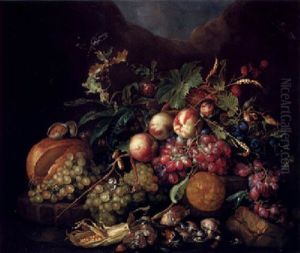 A Swag Of Grapes, Horse-chestnuts, A Lemon, Blackberries, Oranges, Quinces And Ears Of Wheat Hanging From A Bow, With Snails