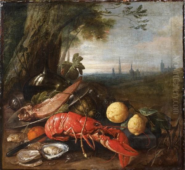Nature Morte Au Homard Et Citrons Dans Un Paysage Devant La Ville D'anvers