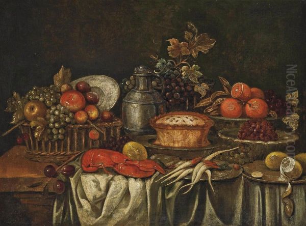 Plums And Fruit In A Basket, A Lobster, Lemons, Oranges, Grapes, A Jug And A Pie On A Partially Draped Table