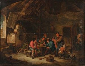 A Tavern Interior With A Fiddler And Peasants Smoking, Drinking And Playing Cards