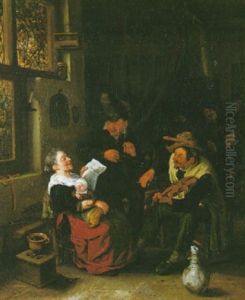 An Interior Of A Tavern With Peasants Drinking And A Fiddler Playing