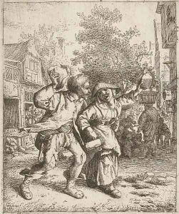 A Village Scene With A Family Sitting Outside A House With Revellers Beyond