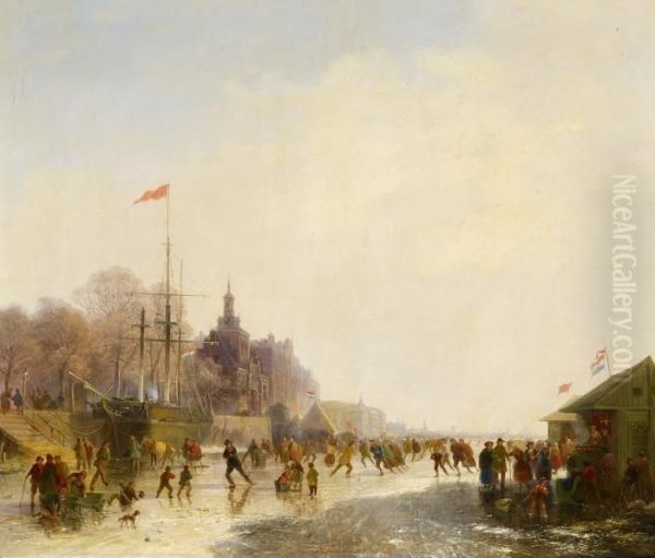 Ice Skaters On A Frozen River, Most Likely Near Rotterdam