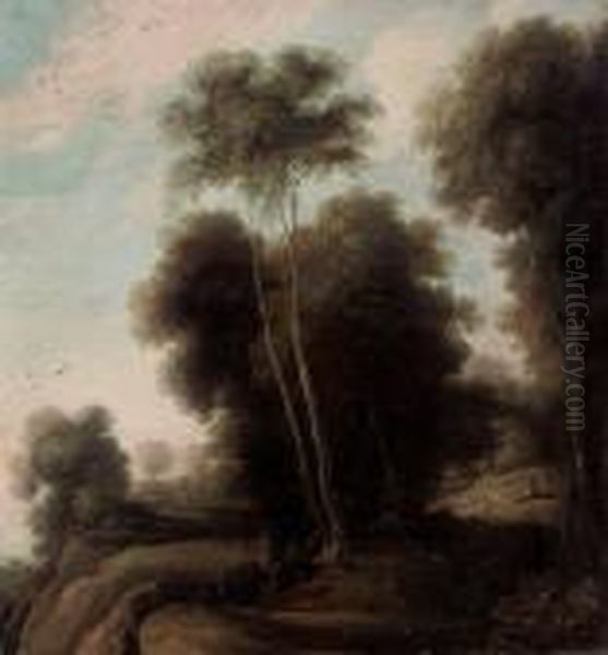 A Wooded Landscape With A Shepherd And His Flock On A Track