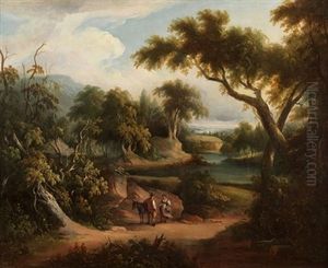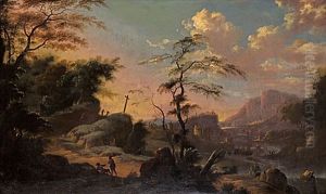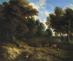 An Extensive Wooded Landscape With Herdsmen By A Stream