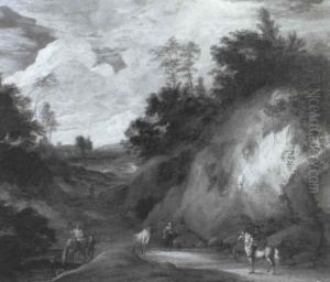 A Rocky Italianate Landscape With A Traveller And Washerwoman On A Track, A Peasant And Donkey...