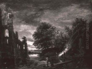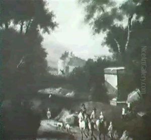 Wooded River Landscape With Figures On The Near Bank