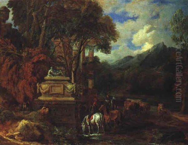 Ein Reiter Trankt Seine Pferde In Einer Landschaft, Vor Einem Antiken Monument
