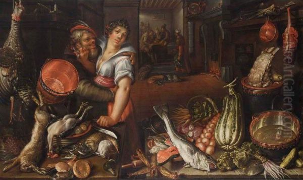 A Kitchen Still Life With Fowl, A Copper Pot, Rolls On Tin Plates, Apples And Black Grapes In A Basket And Mushrooms On A Stoneware Plate, All On A Table, Together With Herring, A Salmon, And Other Fish, A String Of Onions, Red Cabbages And Other Vegetabl