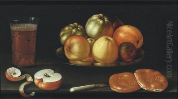 Still Life With Apples And Other Fruit On A Tazza, Together Witha Glass Of Beer, A Partly Peeled Apple, A Knife And Two Breadrolls