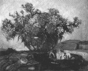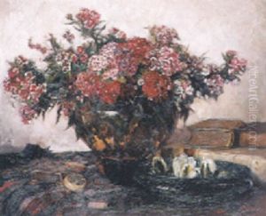 Sweet Williams In A Bowl With Books And A Dish On A Draped Table
