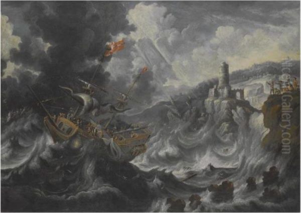 A Coastal Landscape With Shipping Caught In Tempestuous Seas
