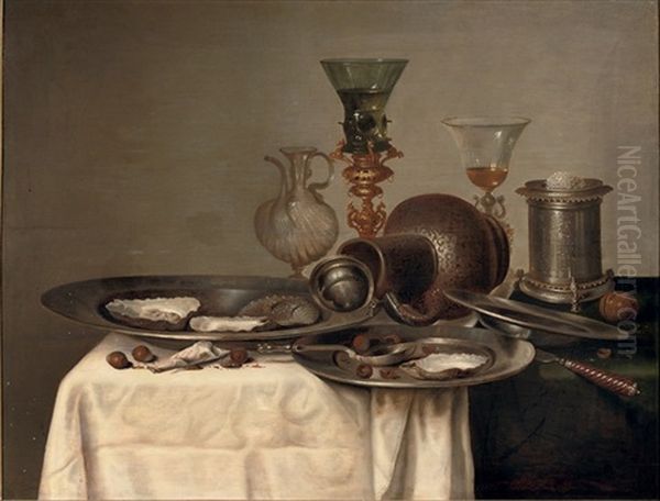 Oysters And Hazelnuts On Pewter Dishes, A Roemer In A Bekerschroef, A Silver Salt Cellar And An Earthenware Jug, All On A Partly Draped Table