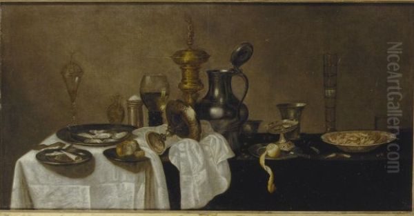 Still life with precious cups and glasses, shrimps and oyster on a partially draped table