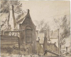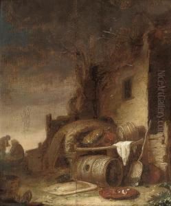 Bowls, Vessels And Flagons By A Barrel In A Cottage Yard