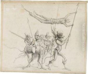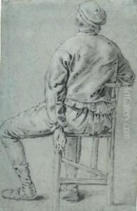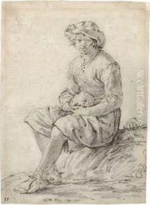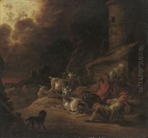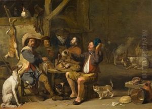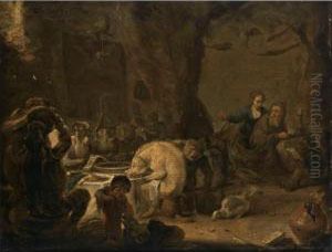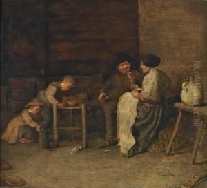 Interior Of A Stable With A Peasant Playing The Flute And One Drinking, With A Large Jug To The Right