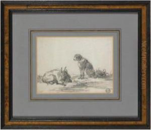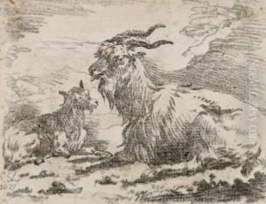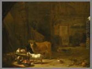 A Barn Interior With A Still Life Of A Milk Jug, Barrel And An Assortment Of Pots, With Three Goats In The Background