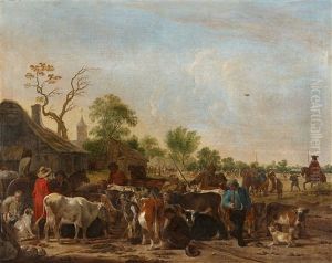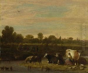 Lanscape With Farmhands And Livestock At A Stream, Farm Buildings Beyond