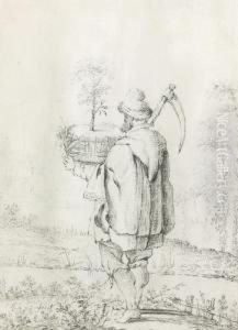 A Barn Interior With Vegetables, And Kitchen Utensils, A Peasant Carrying A Basket Beyond