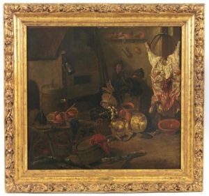 A Barn Interior With Vegetables And Kitchen Utensils, A Peasant Carrying A Basket Beyond