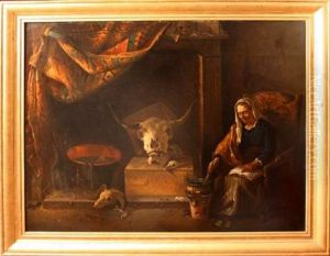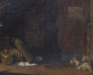 A Barn Interior With A Still Life Of A Milk Jug, Barrel And An Assortment Of Pots, With Three Goats In The Background