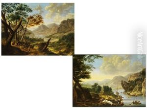 Blick Von Einer Gebirgigen Anhohe Ins Tal Mit Flusslauf (+ Flusslauf Mit Kahnen In Felsiger Gegend; Pair)