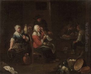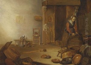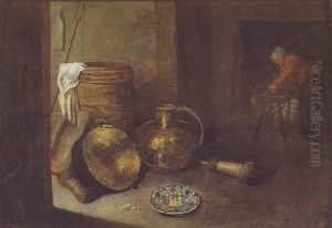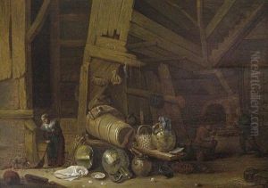 A Barn Interior With A Still Life With Kitchen Utensils In The Foreground, Together With A Woman And A Child