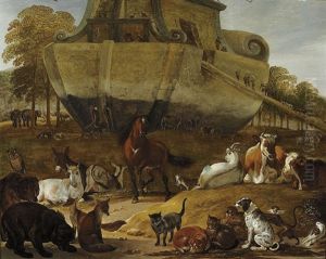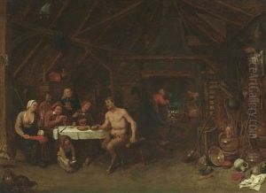 An Interior With A Goat Eating An Oyster, A Donkey At A School Desk, A Cat Playing Tric-trac And Other Mythical Creatures