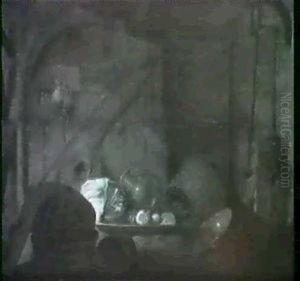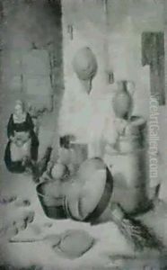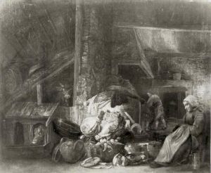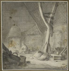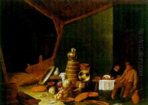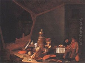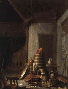A Barn Interior With A Basket,a Barrel, Fish Turnips And Other Objects