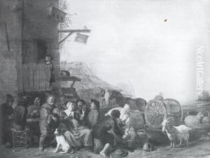 Huntsman Feeding His Dogs Under A Portico With A Farmyard Beyond