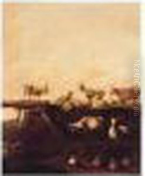 A Riverbank With Goats, Sheep And Ducks By A Bridge