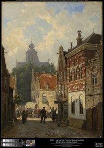 Townsfolk Gathered Around Market Stalls, A Capriccio View Ofwoerden's Cityhall In The Background