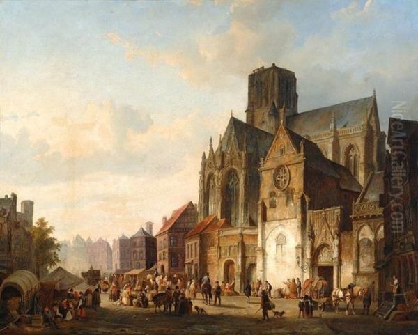 A View Of A City With Many Figures On A Church Square